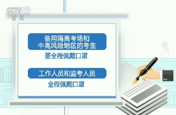 备用隔离考场和中高风险地区的考生要全程佩戴口罩。工作人员和监考人员全程佩戴口罩。