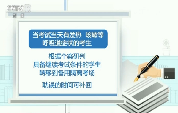 当考试当天有发热、咳嗽等呼吸道症状的考生,根据个案研判,具备继续考试条件的学生转移到备用隔离考场,耽误的时间可补回。