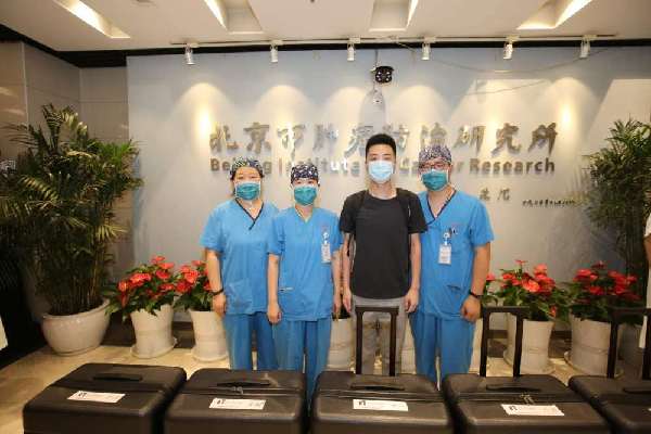 二次奔赴地坛医院前,柳峰的护士长和同事为他送行。(左三为柳峰)