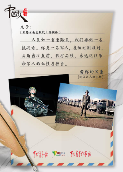 2017年,我大学毕业,成为了一名武警战士。初到部队,甘南高原高寒枯燥的生活让我有些不适应,思家的情绪经常情不自禁地涌上心头。父亲似乎读懂了我的心思,写信告诉我:“‘吃苦’其实是一剂良药。你现在待的地方环境确实有些艰苦,但是,这样恰恰能将你磨砺出来,只要你肯吃苦,我坚信你会成为你想成为的样子。”