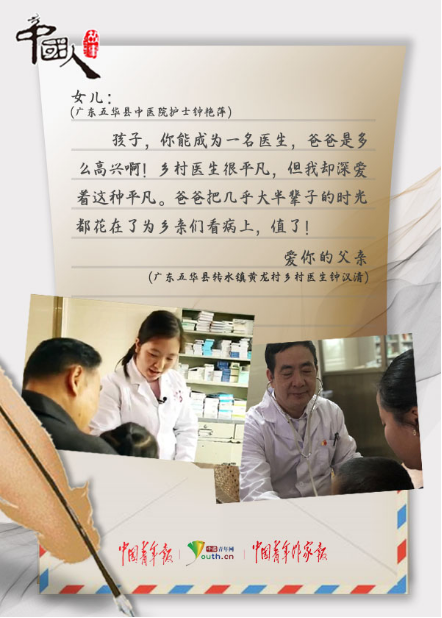父亲有很多次离开村子的机会,但是他不肯。他总说,他不能走,乡亲们需要他。他对乡亲们看病的执着,让我从小就有了救死扶伤的梦想。毕业后,我来到了五华县中医院,成为了一名护士。业余时,我会回到黄龙村卫生站,给父亲打打下手。虽然县城农村来回奔波有点辛苦,但我的内心却非常充实快乐。父亲用行动教会了我仁心仁术,这是我一辈子的财富。以心为灯,我们愿作生命的守护者。