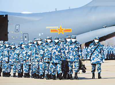 资料图片:2月17日,军队增派支援武汉抗击新冠肺炎疫情的又一批1200名医务人员,分别通过航空和铁路输送抵达武汉。图为医疗队队员抵达武汉天河机场后快速集结。本报记者 王传顺摄
