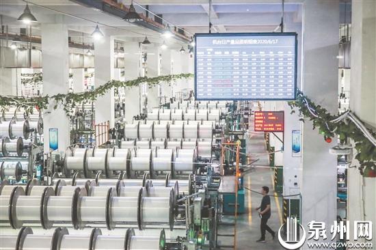 位于晋江五里工业区的信泰集团经编车间内,机器快速运转。机器上方悬挂的终端显示屏上,清晰显示着“机台日产量品质明细表”。