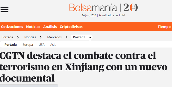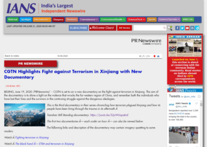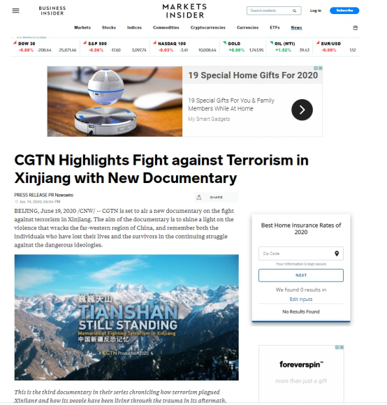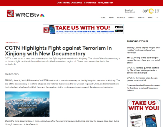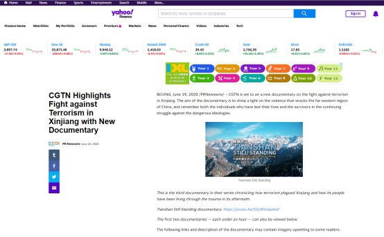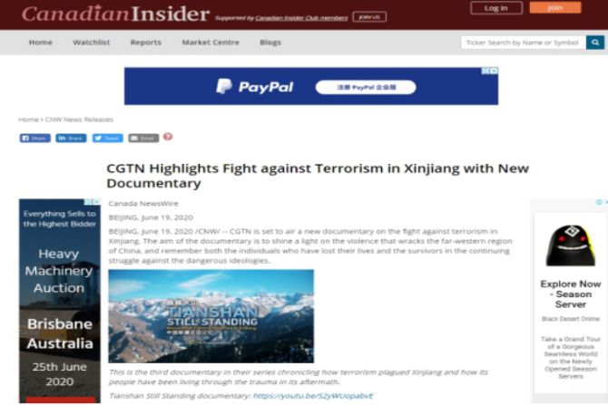 2019年12月5日和7日,CGTN先后播出了两部以新疆反恐为主题的纪录片《中国新疆,反恐前沿》和《幕后黑手——“东伊运”与新疆反恐》,以罕见的“大尺度”披露了新疆反恐三十年中的严峻形势与深层原因,引发了国内外观众极大关注。时隔半年,CGTN再次重磅推出第三部反恐纪录片《巍巍天山——中国新疆反恐记忆》。该纪录片及相关报道被全球27个国家和地区的475家网络媒体全文转载,全网阅读量达5.17亿,呈现出多元化传播态势,覆盖受众广泛,再次成为舆论焦点。