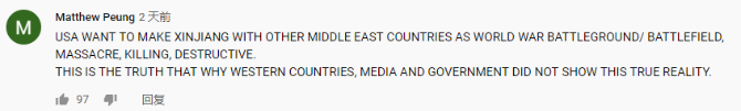 网友Matthew Peung说,美国想让新疆和其他中东国家成为世界大战的战场。这就是为什么西方国家、媒体和政府没有展现出真实的事实。