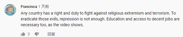 网友Francisca说,任何国家都有权利和义务打击宗教极端主义和恐怖主义。要根除这些邪恶,仅靠镇压是不够的。正如视频显示的那样,教育和获得体面工作的机会也是必要的。