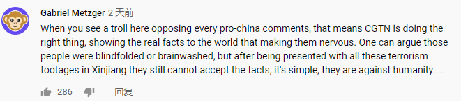 网友Gabriel Metzger在CGTN Youtube平台评论称,“当你看到一个喷子在这里反对每一个亲华评论时,这意味着CGTN正在做正确的事情,即向世界展示让他们紧张的事实。有人可能会说,这些喷子是被蒙住了眼睛或者被洗脑了,但是看到新疆的恐怖主义镜头后,他们仍然不能接受事实,很简单,他们是反人类的。毕竟,是美国首先资助了恐怖主义。”