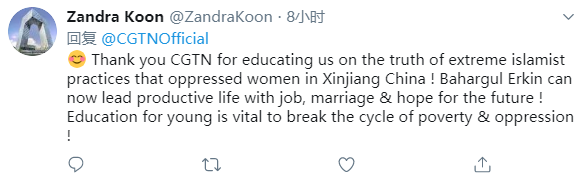 网友Zandra Koon(@ZandraKoon)发表观后感言,称“感谢CGTN让我们了解到极端伊斯兰主义压迫中国新疆妇女的真相!Bahargul Erkin(纪录片中受访人物)现在可以通过工作、婚姻和对未来的希望过上充实的生活了!年轻人的教育对打破压迫与贫穷的循环至关重要!”