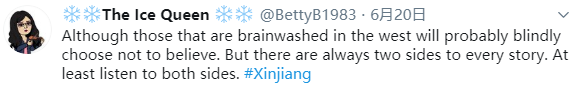 网友The Ice Queen(@BettyB1983)转发CGTN美洲平台发布的纪录片视频,并评论称“尽管那些在西方被洗脑的人可能会盲目地选择不相信。但每个故事都有两面性。至少要听听双方的意见。”