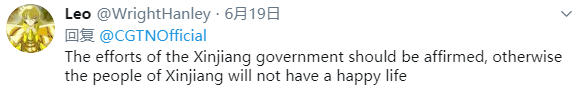 网友Leo(@WrightHanley)在CGTN推特账号下留言表示,“新疆政府的努力应该得到肯定,否则新疆人民将不会有幸福的生活。”