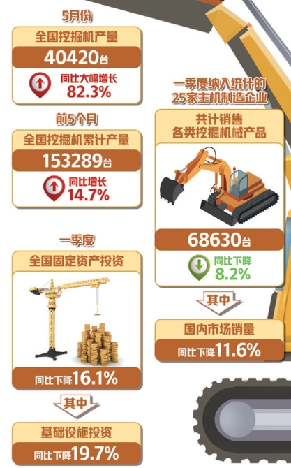 国家统计局公布的数据显示,5月份,全国挖掘机产量40420台,同比大幅增长82.3%;前5个月,全国挖掘机累计产量153289台,同比增长14.7%。