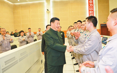 △2018年2月10日,习近平在驻四川部队某基地发射场同科技人员亲切交谈,询问他们的科研工作和生活情况。