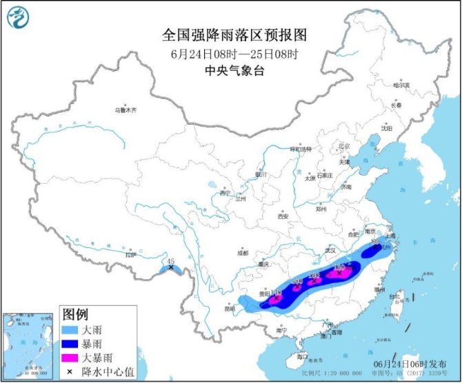 中央气象台6月24日06时继续发布暴雨黄色预警:预计,6月24日08时至25日08时,贵州南部、广西北部、湖南中部、江西中北部、福建西北部、安徽南部、浙江中北部等地的部分地区有大到暴雨,其中,贵州东南部、广西北部、湖南中部、江西中部等地局地有大暴雨(100~180毫米)。上述部分地区伴有短时强降水(最大小时降雨量30~60毫米,局地可超过70毫米),局地有雷暴大风等强对流天气。