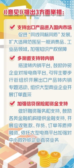 今年《政府工作报告》提出,围绕支持企业增订单稳岗位保就业,加大信贷投放,扩大出口信用保险覆盖面,降低进出口合规成本,支持出口产品转内销。