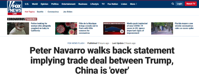 而福克斯估计也不太爽,在后续报道中直接怼了回去,标题就是《Peter Navarro walks back statement implying trade deal between Trump, China is 'over'》(《纳瓦罗收回自己暗示中美贸易已经“结束”的言论》),注意,用词是“收回”。