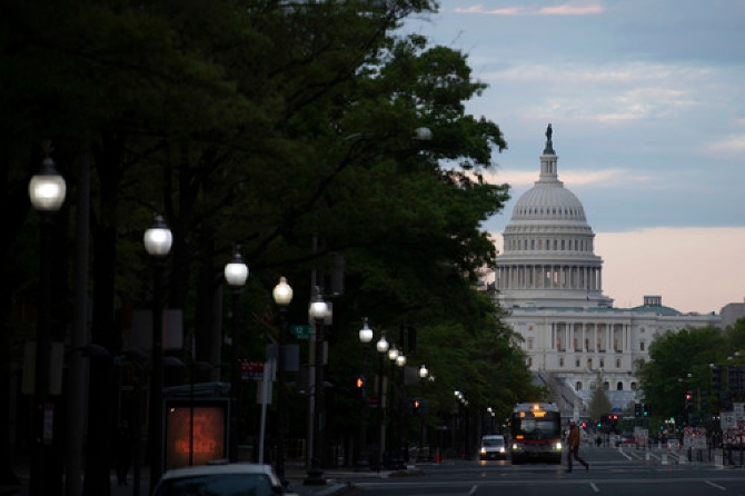 这是4月22日在美国首都华盛顿拍摄的日落时分的国会大厦。新华社记者 刘杰 摄