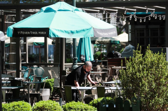 6月22日,在美国纽约布莱恩特公园,一名餐厅工作人员在户外就餐区做准备。新华社记者 王迎 摄