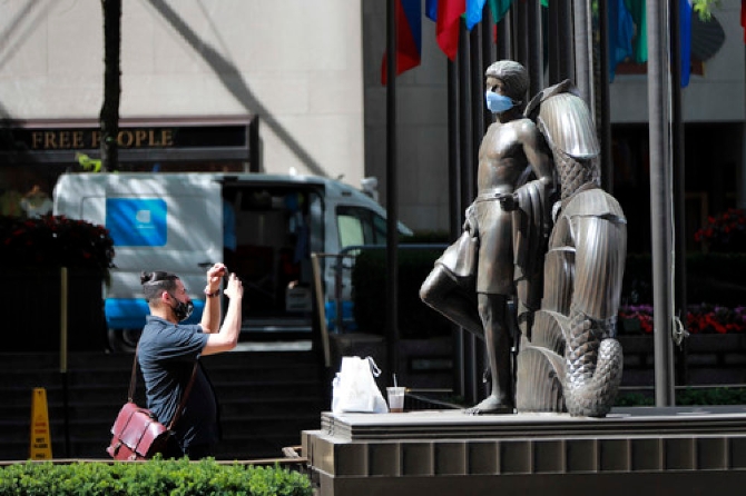 6月22日,在美国纽约洛克菲勒中心,一名男子拍摄“戴”口罩的雕像。新华社记者 王迎 摄