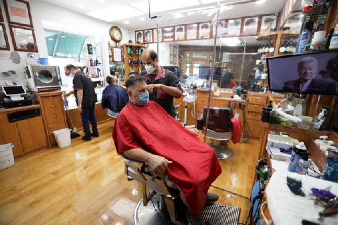 6月22日,顾客在美国纽约一家理发店理发。新华社记者 王迎 摄