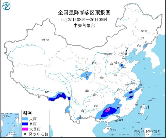 中央气象台6月25日06时发布暴雨蓝色预警:预计,6月25日08时至26日08时,广西中东部、湖南南部、广东北部、江西西部和东北部、福建西北部、浙江中西部、上海等地的部分地区有大到暴雨,其中,广西东北部局地有大暴雨(100~150毫米)。另外,甘肃南部、河北东部、山东西北部、辽宁东部、云南西部和南部、西藏东南部等地的部分地区有大雨,局地暴雨。上述部分地区伴有短时强降水(最大小时降雨量30~50毫米,局地可超过70毫米),局地有雷暴大风等强对流天气。
