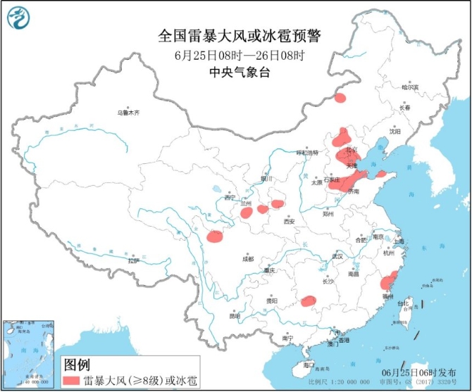 中央气象台还在同一时间继续发布强对流天气蓝色预警:预计6月25日08时至26日08时,甘肃南部、内蒙古中东部、河北、北京、天津、山东北部等地的部分地区将有8-10级雷暴大风或冰雹天气,其中甘肃南部、陕西中部、河北、北京中南部、天津、山东北部等地的部分地区伴有小时雨量20-40毫米的短时强降水,局地可达50毫米。另外,广西中部、广东北部、湖南东南部、江西中部、浙江东南部、福建北部和西南部、云南中东部等地的部分地区有短时强降水天气,预计小时雨量30-50毫米,局地可达70毫米以上;其中浙江南部、福建东北部、广西北部等地局地伴有8-9级雷暴大风。