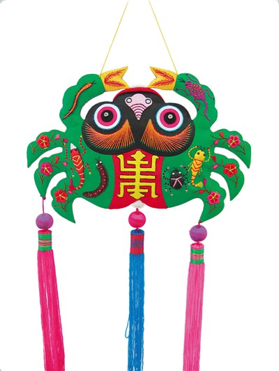 甘肃庆阳的香包历史悠久,品类繁多,其中以“螃蟹”香包最具特色。当地人将螃蟹视为毒物,在螃蟹身上缀以蝎子、蜈蚣、蛇、壁虎、蜘蛛等五种毒虫,用以毒攻毒的方式防御毒害。避五毒是端午节的重要内容。“五毒”的形象,自汉代便已出现。宋人周密在《武林旧事》卷三中记载,宋代宫廷中“插食盘架,设天师、艾虎,意思山子数十座,五色蒲丝、百草霜,以大合三层,饰以珠翠、葵、榴、艾花、蜈蚣、蛇、蝎、蜥蜴等,谓之‘毒虫’。”实际上,夏季的毒虫不计其数,“五”只是个虚数。人们将五毒的形象绣制在香包或儿童衣物之上,既是为了避免毒虫侵害,也有让小儿辨识毒虫的科普作用。
