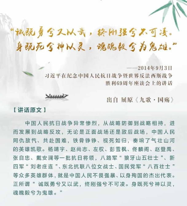 2014年9月3日,在纪念中国人民抗日战争暨世界反法西斯战争胜利69周年座谈会上,习近平缓缓念出屈原的传世名句,“诚既勇兮又以武,终刚强兮不可凌。身既死兮神以灵,魂魄毅兮为鬼雄”,盛赞中国人民同仇敌忾、共赴国难,铁骨铮铮、视死如归,奏响了气壮山河的英雄凯歌。