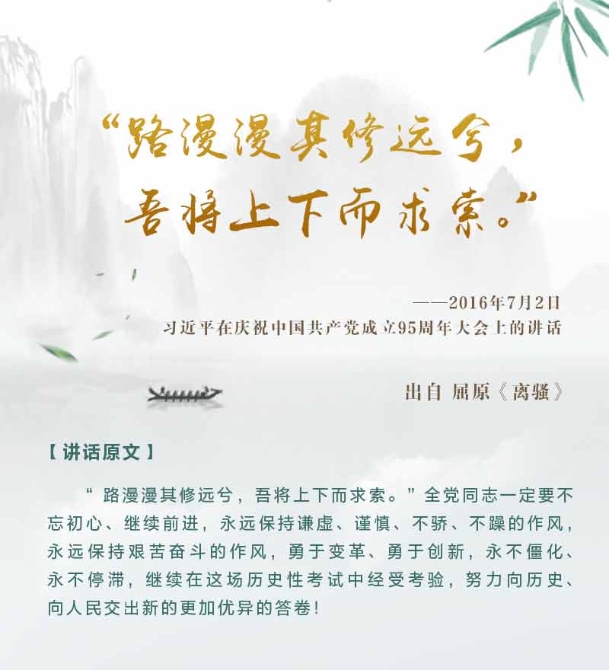 “路漫漫其修远兮,吾将上下而求索。”2016年7月,在庆祝中国共产党成立95周年大会,习近平娓娓道出屈原的名句,号召全党同志不忘初心、继续前进,勇于变革、勇于创新,永不僵化、永不停滞。