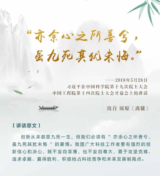 “创新从来都是九死一生。”2018年5月,在中国科学院第十九次院士大会、中国工程院第十四次院士大会开幕会上,习近平引用屈原的“亦余心之所善兮,虽九死其犹未悔”,鼓励广大科技工作者勇于攻坚克难、追求卓越、赢得胜利。