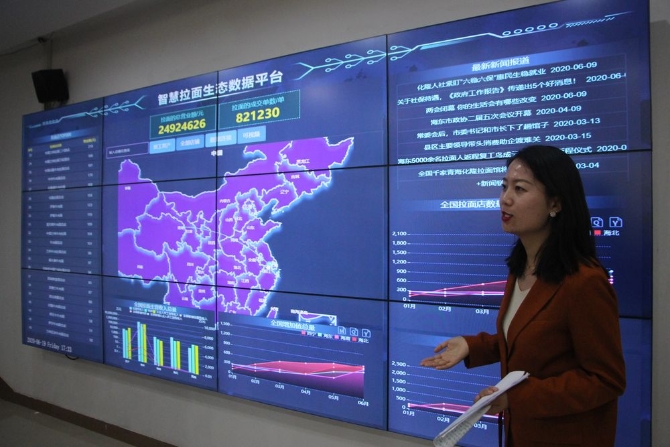 6月19日,青海拉面产业电商服务中心的工作人员介绍智慧拉面生态数据平台。新华社记者 周喆 摄