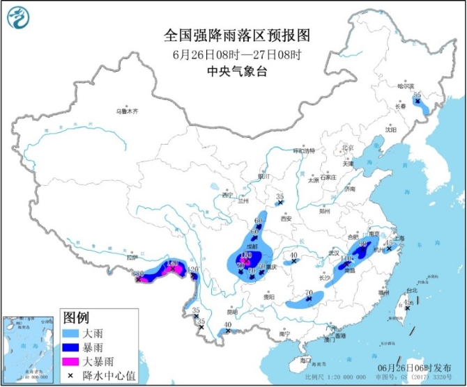 人民网北京6月26日电 中央气象台发布暴雨蓝色预警:预计,6月26日08时至27日08时,吉林东部、甘肃南部、四川盆地中西部、广西中北部、湖南南部和西北部、江西中北部、浙江中北部、安徽南部、云南西部和南部、西藏东南部等地的部分地区有大到暴雨,其中,四川中南部、西藏东南部等地局地有大暴雨(100~180毫米)。上述部分地区伴有短时强降水(最大小时降雨量30~50毫米,局地可超过60毫米),局地有雷暴大风和冰雹等强对流天气。