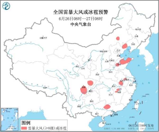 中央气象台发布强对流天气蓝色预警:预计6月26日08时至27日08时,山东中北部、辽宁西部、内蒙古中东部等地的部分地区将有8-10级雷暴大风或冰雹天气,其中甘肃南部、山东中部、辽宁西部、吉林东部等地的部分地区伴有小时雨量20-40毫米的短时强降水,局地可达50毫米。另外,四川中东部、重庆中西部、贵州西南部和北部、湖北西部和东南部、广西北部、广东北部、湖南北部和南部、安徽中南部、江西北部、浙江、江苏西南部、福建东部和北部、云南西部和南部等地的部分地区将有短时强降水天气,预计小时雨量30-50毫米,局地可达60毫米以上;其中广西东北部、广东西北部、四川中东部、江西北部、安徽中南部等地局地将伴有8-9级雷暴大风。