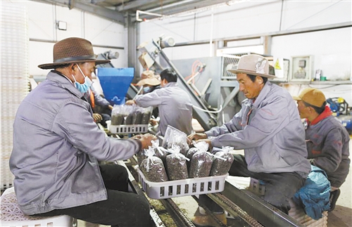 尼木县食(药)用菌工厂化种植基地,白玛旦增(右)正在填装菌包。(资料图片)