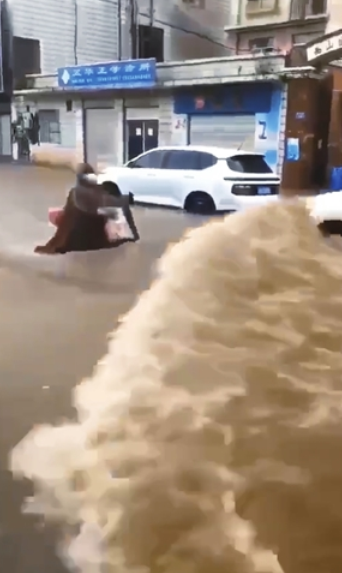 一个视频昨日在微信朋友圈里被频频转发:昆明街头,一个骑电动车的人正在积水的道路里艰难行进。忽然,迎面驶来一辆车,把积水扬起,仿佛海浪一样把骑行者掀翻……这个令人“心酸”的视频拍摄于昨日上午,一夜降雨后,昆明成了泽国。