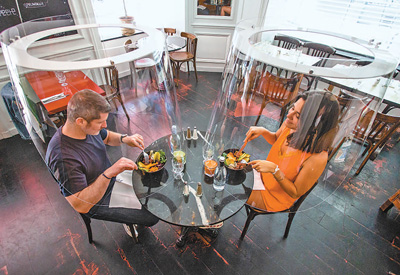 法国设计师研发了一款易于安装、清洁和消毒的保护罩,旨在保护人们疫情期间在餐馆、酒吧、酒店等公共场所用餐时的安全。图为近日,在法国巴黎一家餐馆,客人在保护罩内用餐。新华社发