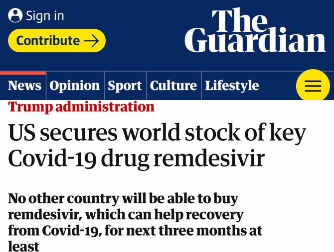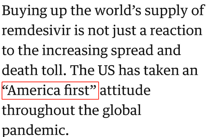 在全球疫情面前,就连药物生产商都“空前“地和仿制药生产商达成了协议。但作为全球疫情“震中”的美国却仍在霸道地“囤货”,甚至于“特朗普达成了一项惊人的协议,以确保美国人能够获得Covid-19的首个授权治疗剂。”