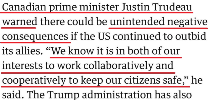 对于美国的霸道“买断”行为,就连盟友都看不下去了,纷纷站出来公开指责美国的行为。加拿大总理特鲁多警告称,美国如果坚持通过恶意竞价的方式打击其盟友,可能会招致意想不到的恶果,“我们知道,只有合作才符合我们双方的利益,并能够保障两国国民的安全。”