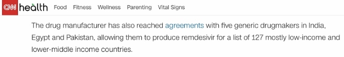 而这位学者所言似乎正在成为“现实”。CNN报道称,瑞德西韦生产商与印度、埃及和巴基斯坦的五家仿制药生产商达成了协议,使他们能够在127个主要为低收入和中低收入国家的清单中生产瑞德西韦。