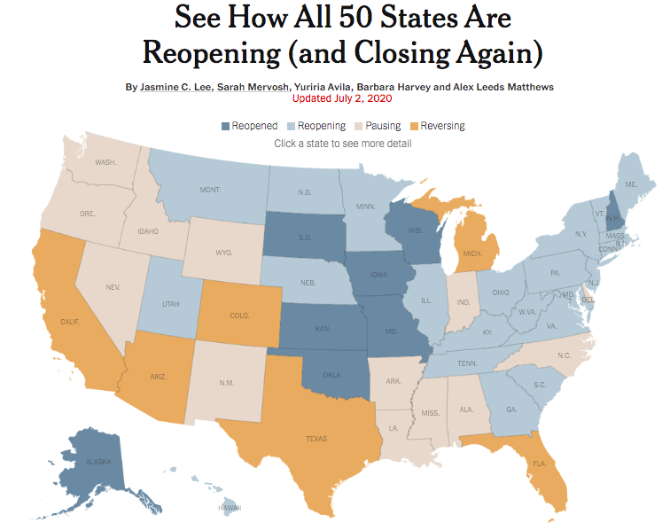 △《纽约时报》相关数据显示,已有6个州因为疫情恶化重新恢复“封闭”。