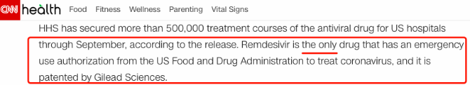 △CNN报道称,瑞德西韦是唯一获得紧急使用授权治疗新冠病毒的药物
