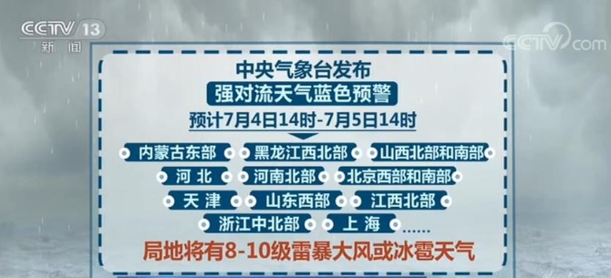 另一个是“强对流天气蓝色预警”。中央气象台今天10时发布强对流天气蓝色预警,预计今天下午2时至明天下午2时,内蒙古东部、黑龙江西北部、山西北部和南部、河北、河南北部、北京西部和南部、天津、山东西部、江西北部、浙江中北部、上海等地局地将有8—10级雷暴大风或冰雹天气。