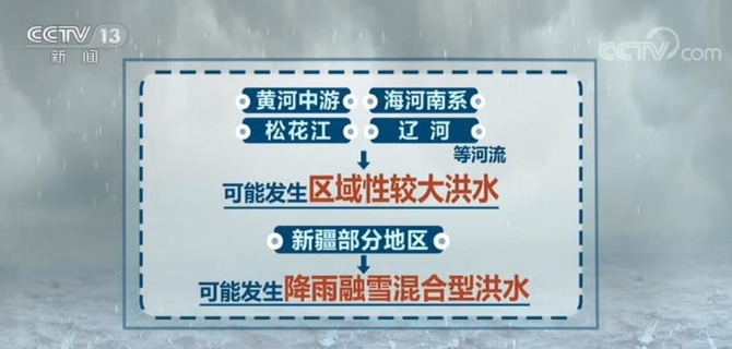 另据气象部门预测分析,今年7月至8月,全国降雨总体偏多,南北方均有多雨区,以北方雨带为主,其中山西、河北、山东、黑龙江、内蒙古、新疆等地部分地区降雨较常年同期可能偏多3—5成。受此影响,黄河中游、海河南系、松花江、辽河等河流可能发生区域性较大洪水,新疆部分地区可能发生降雨融雪混合型洪水。