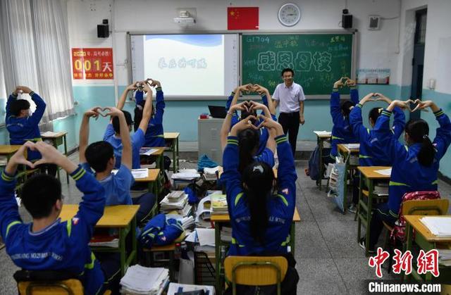 7月5日下午,河北石家庄第25中学一高三年级教室,当班主任给学生们上完“最后一课”时,同学们不约而同的为老师献上比心的手势。(来源:人民日报客户端综合)