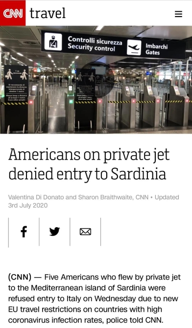 最近,有几位美国游客在入境意大利时就遭到了拒绝。在欧盟新规实施的当天,11名乘客乘坐私人飞机从美国抵达意大利撒丁岛机场。飞机一落地就遭到了边境警察拦截。尽管这些旅客称,欧盟宣布边界政策时,他们已在飞行途中,但其中5名美国籍公民依然没能获准入境,其余持有其他国家护照的访客也必须在隔离结束后才可以自由行动。