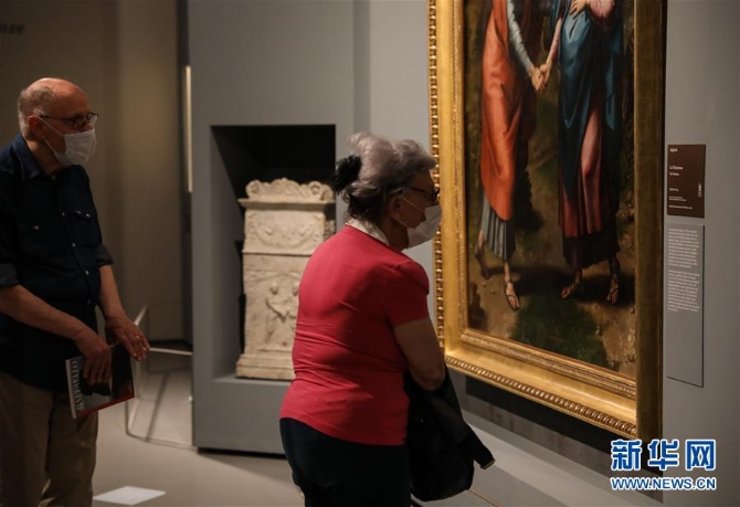 7月2日,在意大利首都罗马奎里纳莱博物馆,人们戴着口罩参观拉斐尔纪念展。 新华社记者 程婷婷 摄
