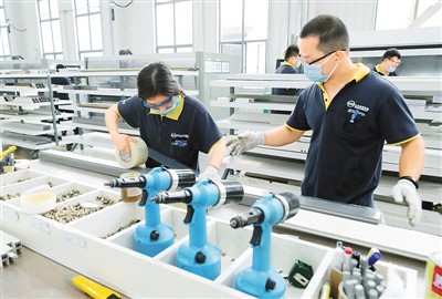一季度,江苏省苏州市规模以上民营工业实现产值2360.4亿元,实现进出口157.2亿美元,占进出口总额的24.7%,同比提高3.0个百分点。图为民营企业苏州天梭电梯有限公司工人在装配车间给产品贴保护膜。华雪根摄(人民视觉) |