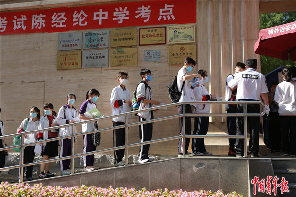 7月7日早晨,排队通过棚子里的自动测温设备后,考生们走进北京市第十二中学的校园,按照指引彼此保持距离、走向各自的考场。中青报·中青网记者 李峥苨/摄