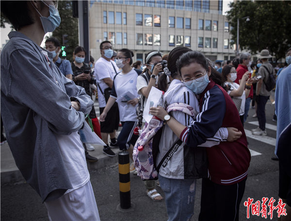 7月7日早晨,位于北京市丰台区的北京市第十二中学考点前,等候进入考场的队伍里,两名考生互相拥抱、彼此鼓励。中青报·中青网记者 李峥苨/摄