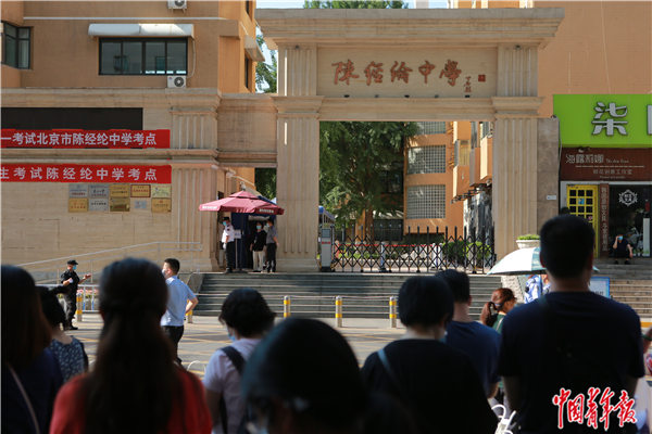 7月7日早晨,北京市朝阳区,陈经纶中学门口,考生入场结束,不少家长在场外等候。中青报·中青网见习记者 曲俊燕/摄