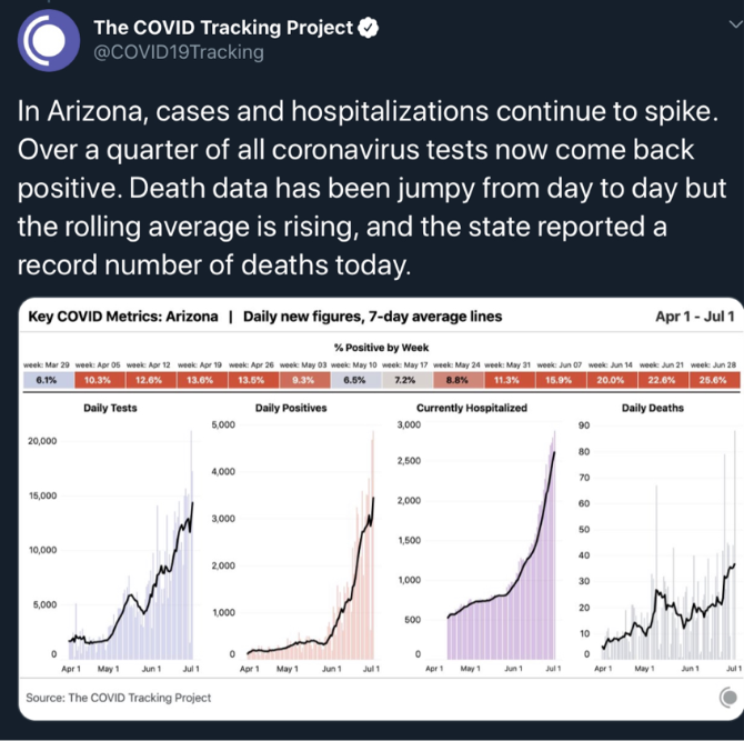 △亚利桑那州从4月1日到7月1日每日新增确诊病例数、每日死亡人数、住院人数与每日新增死亡人数的变化 (图片来源:“新冠病毒追踪计划”网站)
